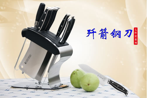 相對“殲箭鋼刀”的高貴與流光潛艦的雍容華貴,“S1004心依順”七件套讓人更生一絲愛意。這套產品中,刀具主體采用高品質5Cr15MoV鋼材,配以不銹鋼與有機玻璃結合刀座作為設計基礎,正所謂一見如故,二見傾心,“心依順”套刀的設計造型更讓愛意正濃的你愛不釋手。想讓你的她/他下廚的心情熱情高漲嗎?“心依順”套刀能夠使您每一次的烹飪都飽含著愛意與激情。