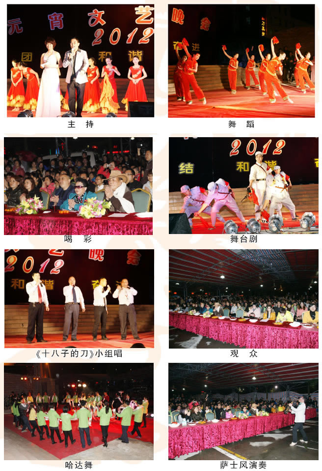 晚會(huì)在歡快歌舞《好日子》拉開了晚會(huì)的序幕。晚會(huì)現(xiàn)場(chǎng),流光溢彩,激情飛揚(yáng),高潮迭起。優(yōu)美動(dòng)聽的歌聲、熱情洋溢的舞姿處處洋溢著喜慶的氣氛和青春的活力。晚會(huì)節(jié)目有獨(dú)唱、小品、優(yōu)美的薩士風(fēng)演奏,還有動(dòng)感十足的街舞表演。除了市歌舞劇團(tuán)帶來(lái)的精彩節(jié)目,我公司的員工也上臺(tái)表演了小組合唱和舞蹈,掀起了晚會(huì)的高潮。最后,一曲《歡聚一堂》為本次元宵文藝晚會(huì)畫上了圓滿的句號(hào)。